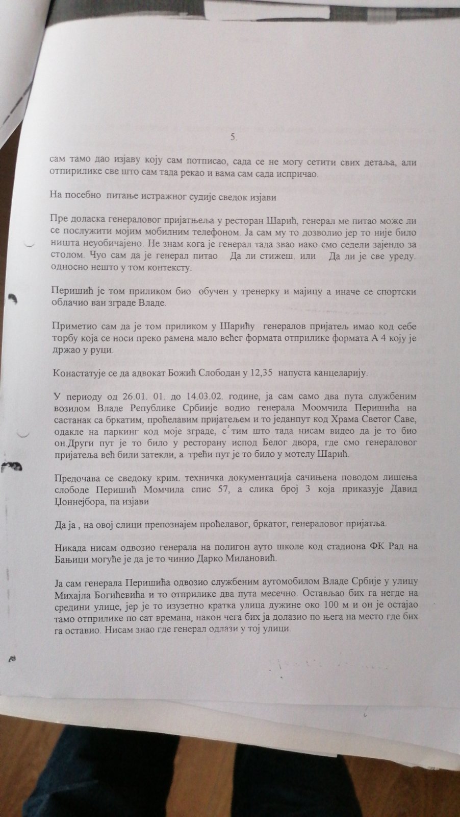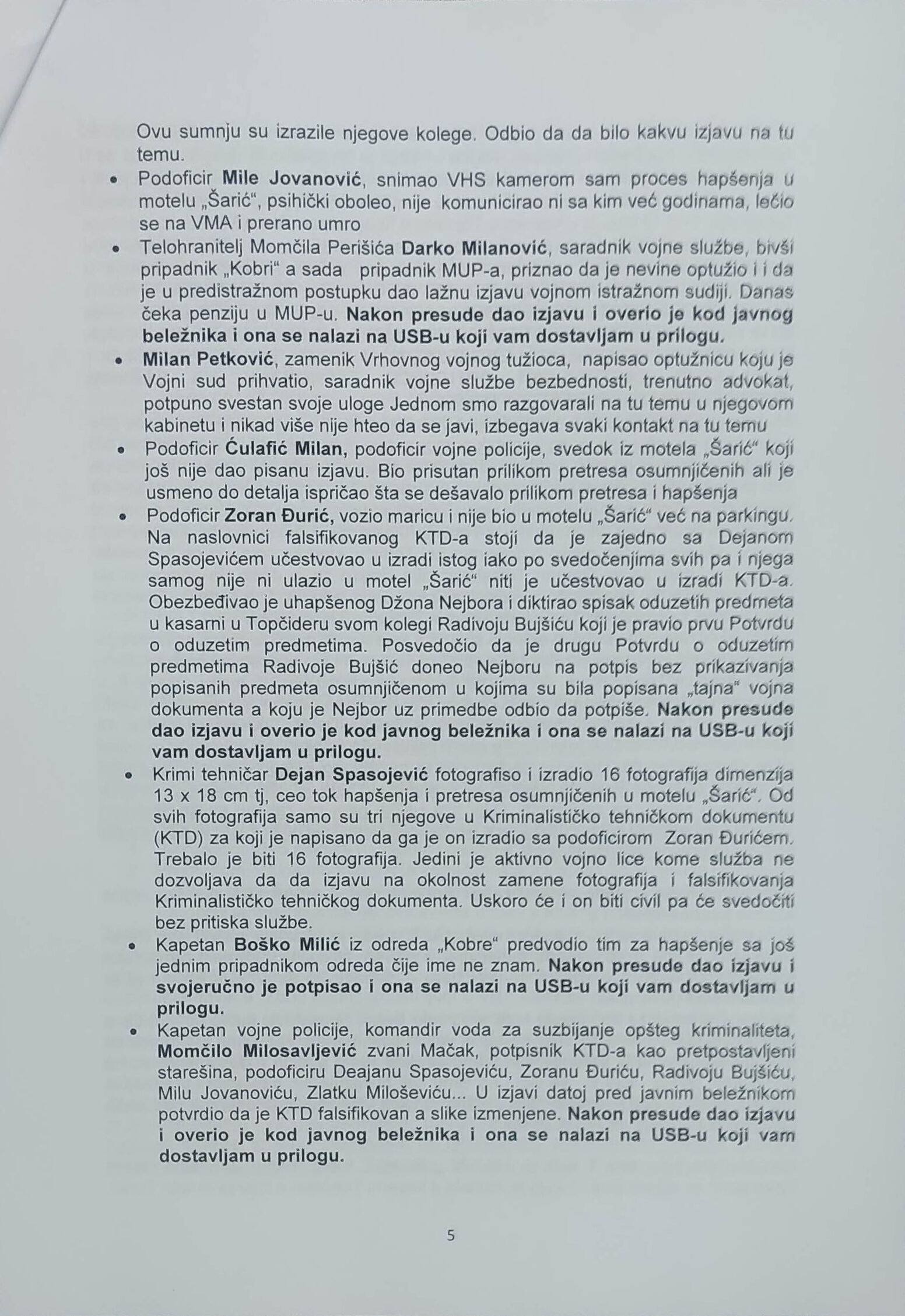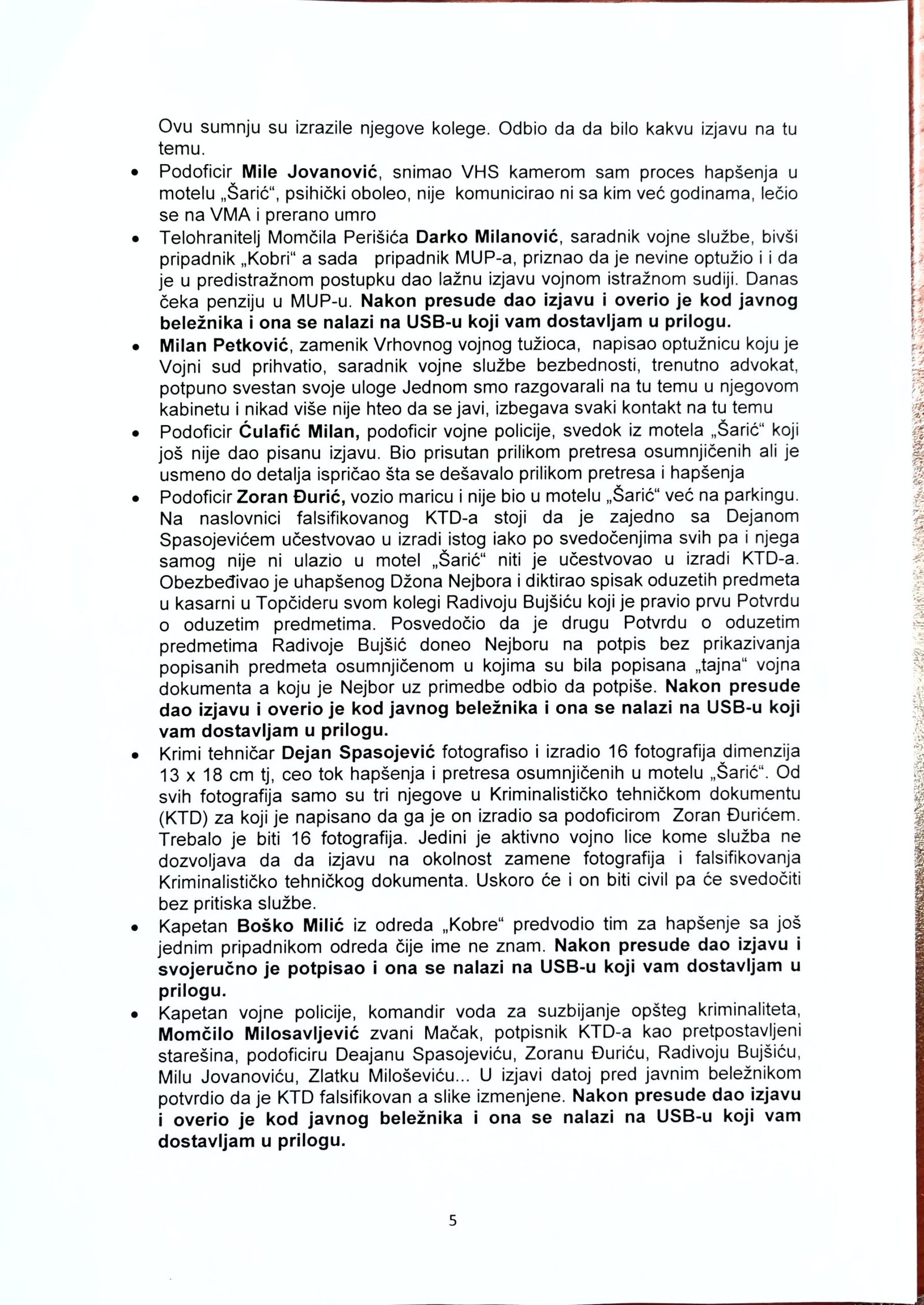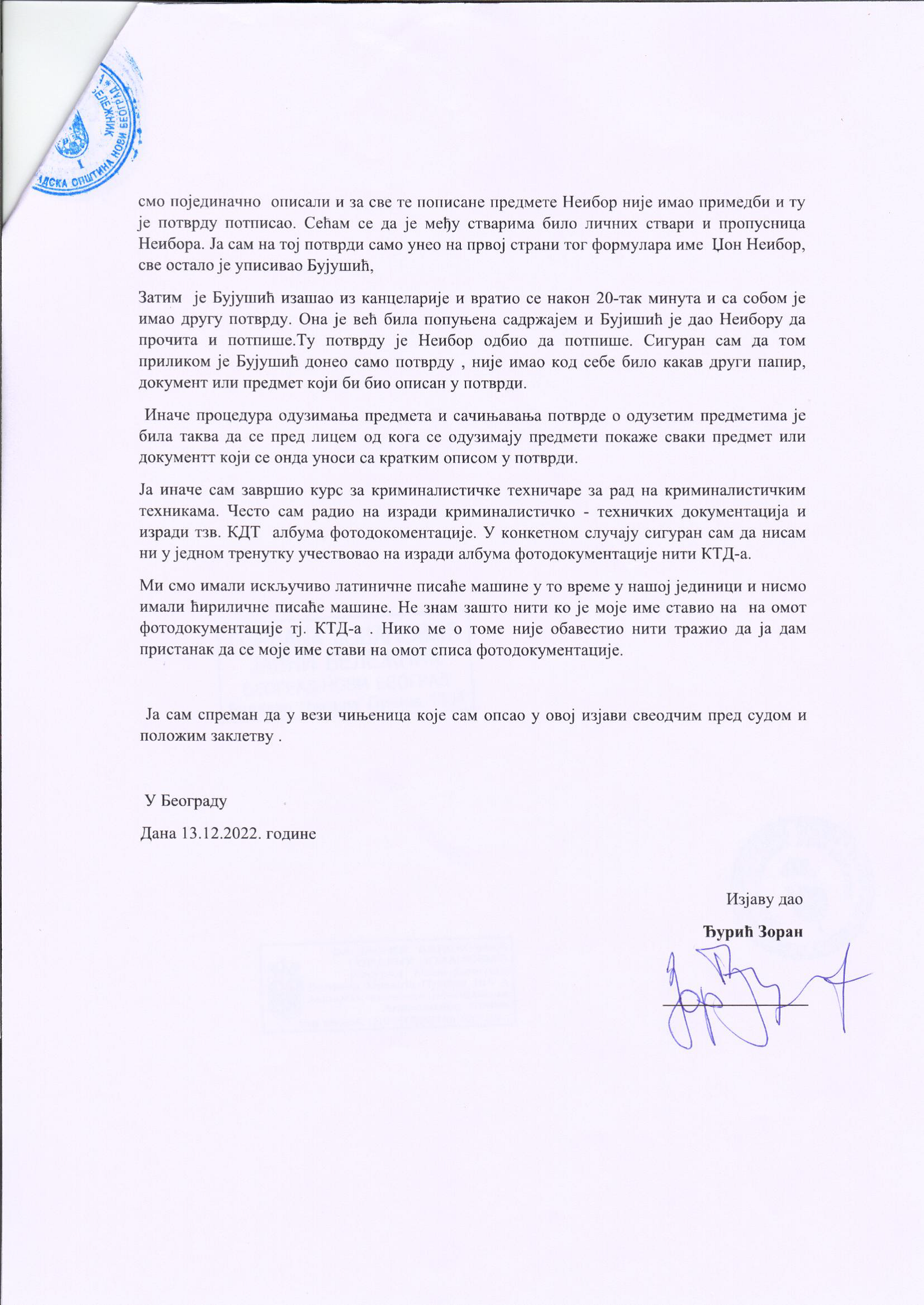 Izjava Zorana Đurića koji tvrdi što i ostali učesnici uviđaja iz motela „Šarić“, da je on vozio „maricu“ i da nije ulazio u restoran, te da nije učestvovao u pretresu osumnjičenih i fotografisanju oduzetih predmeta. Do detalja opisao ko je doneo i kad falsifikovanu potvrdu koju je Džon Nejbor odbio da potpiše.