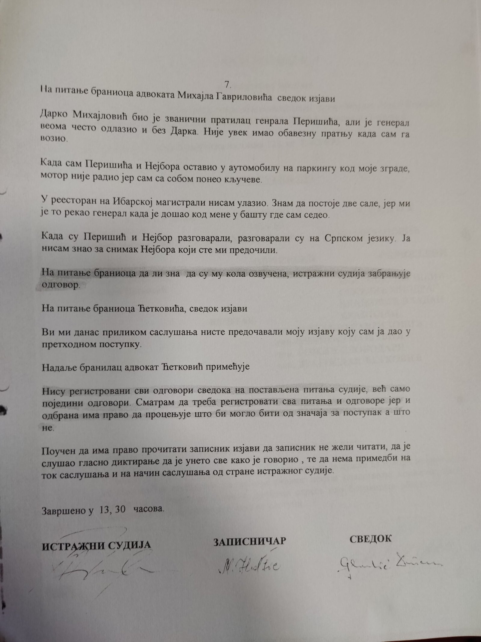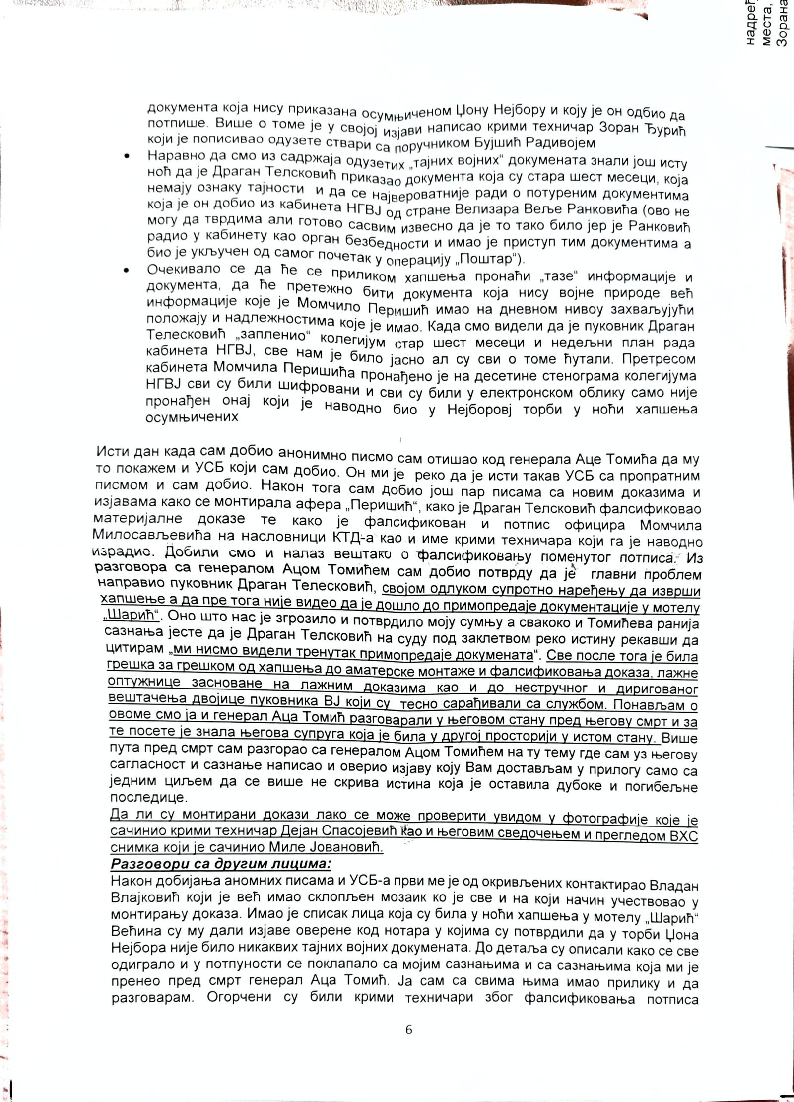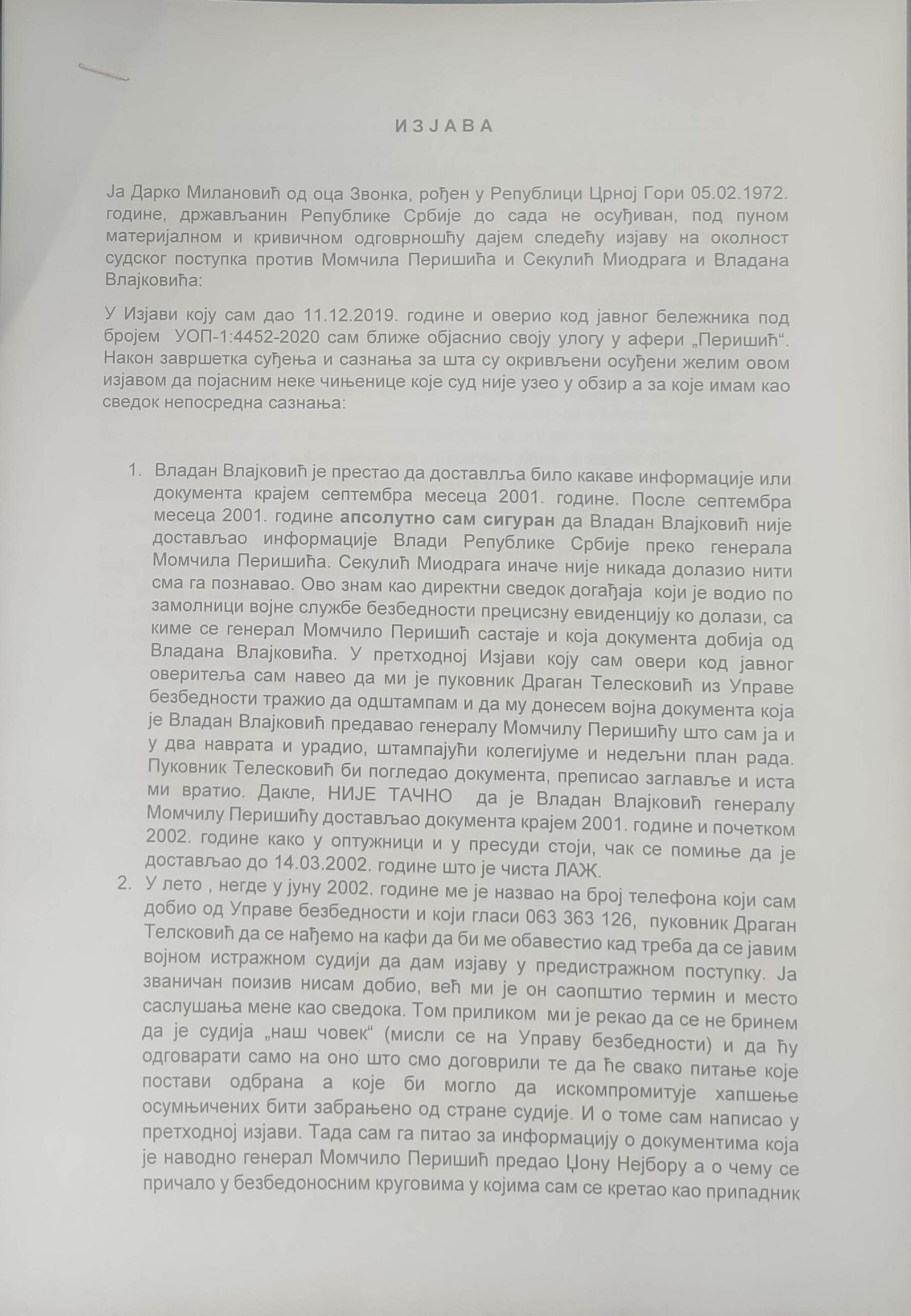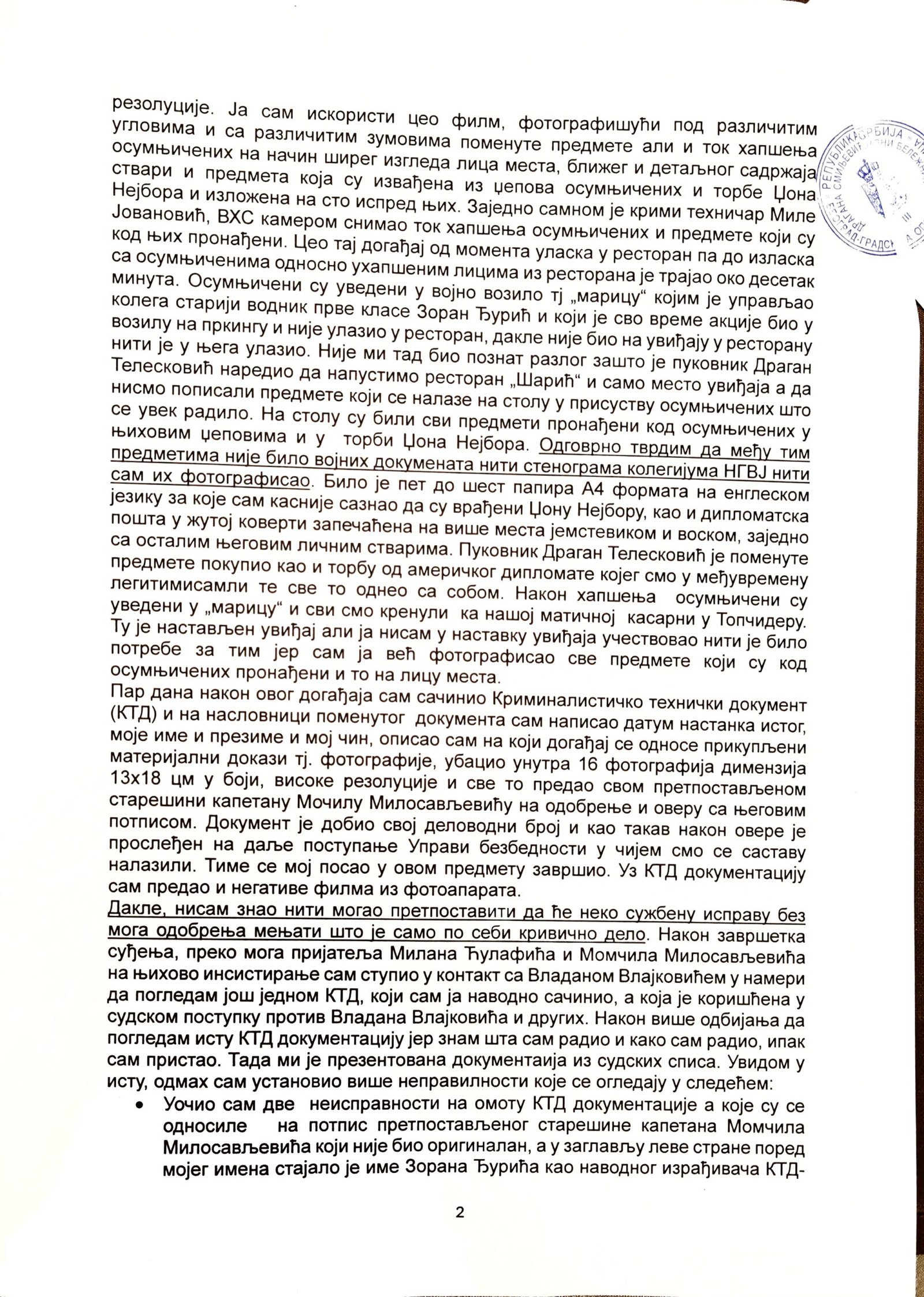 Izjava Zorana Đurića koji tvrdi što i ostali učesnici uviđaja iz motela „Šarić“, da je on vozio „maricu“ i da nije ulazio u restoran, te da nije učestvovao u pretresu osumnjičenih i fotografisanju oduzetih predmeta. Do detalja opisao ko je doneo i kad falsifikovanu potvrdu koju je Džon Nejbor odbio da potpiše.