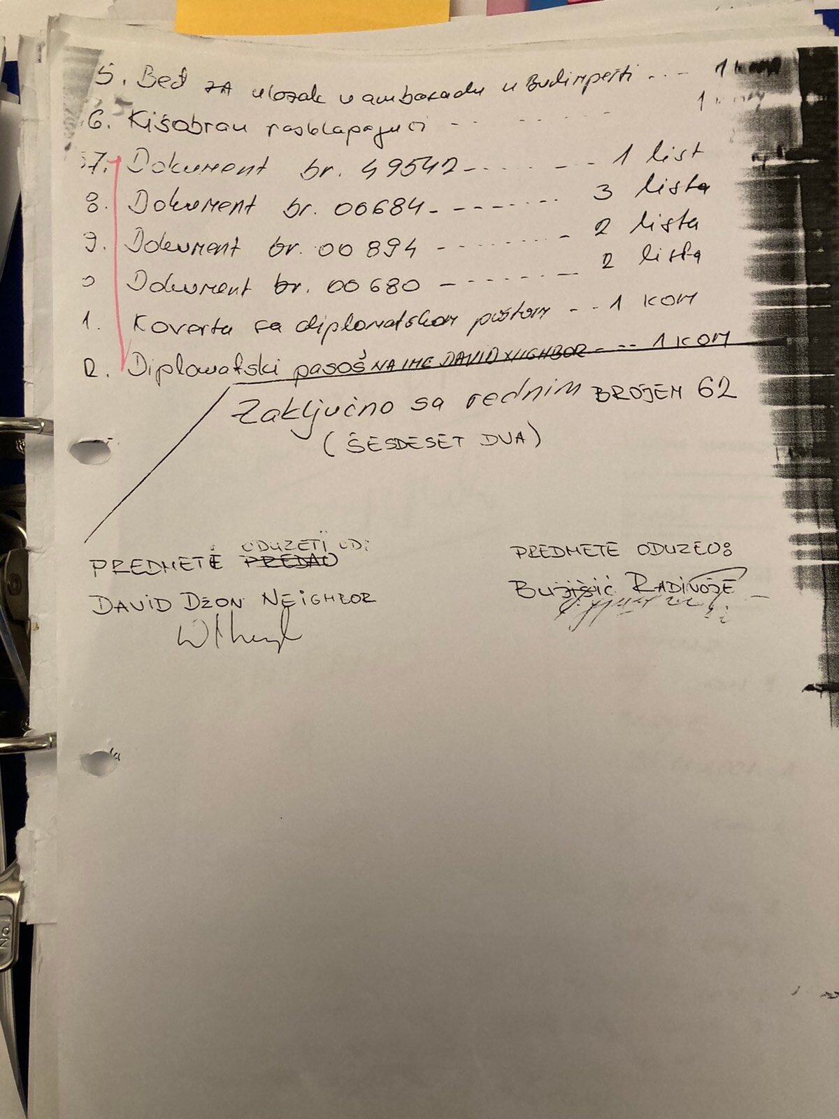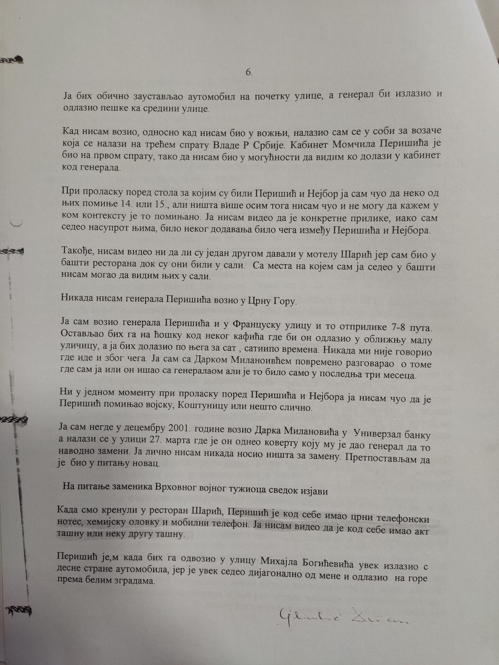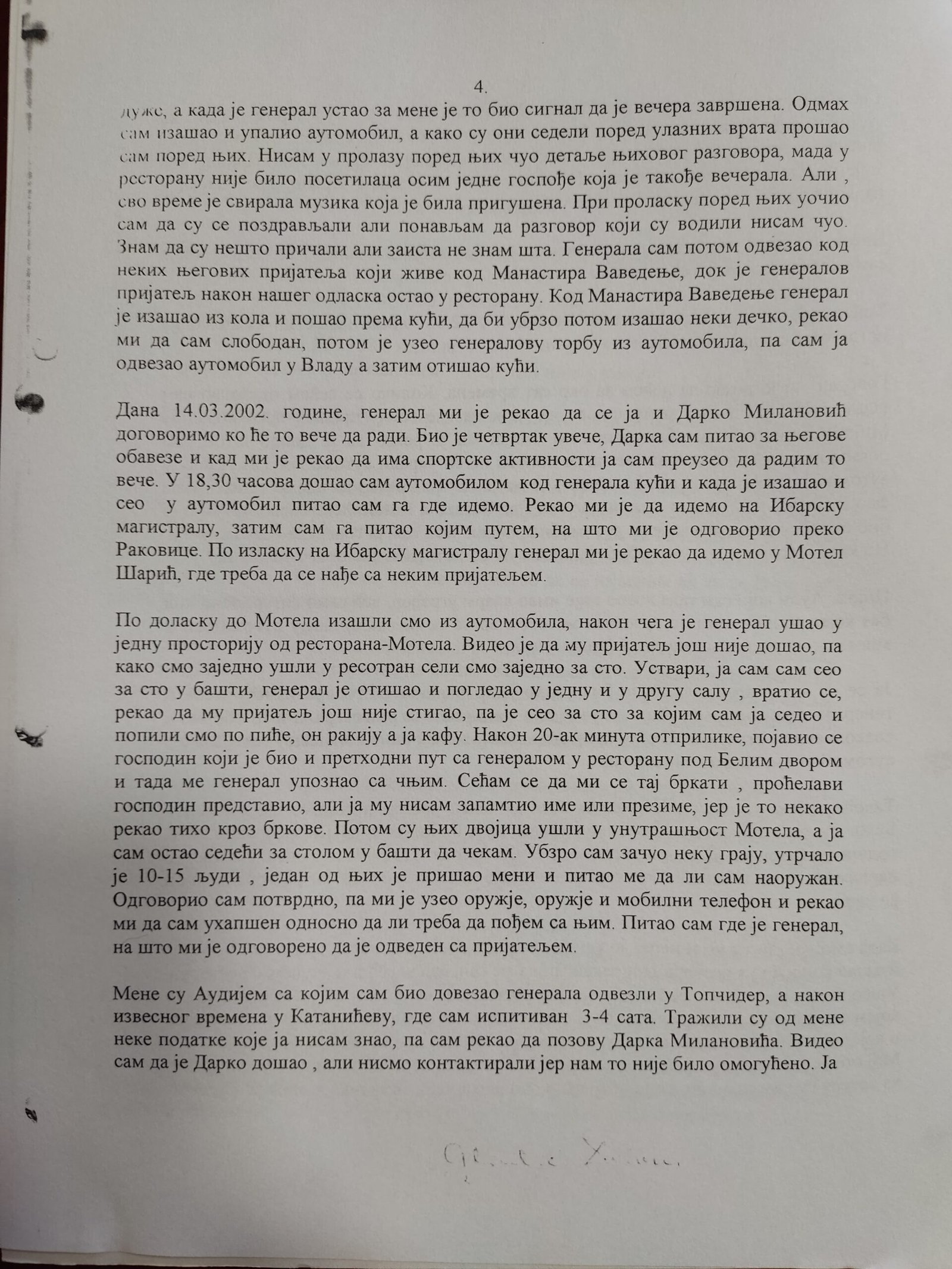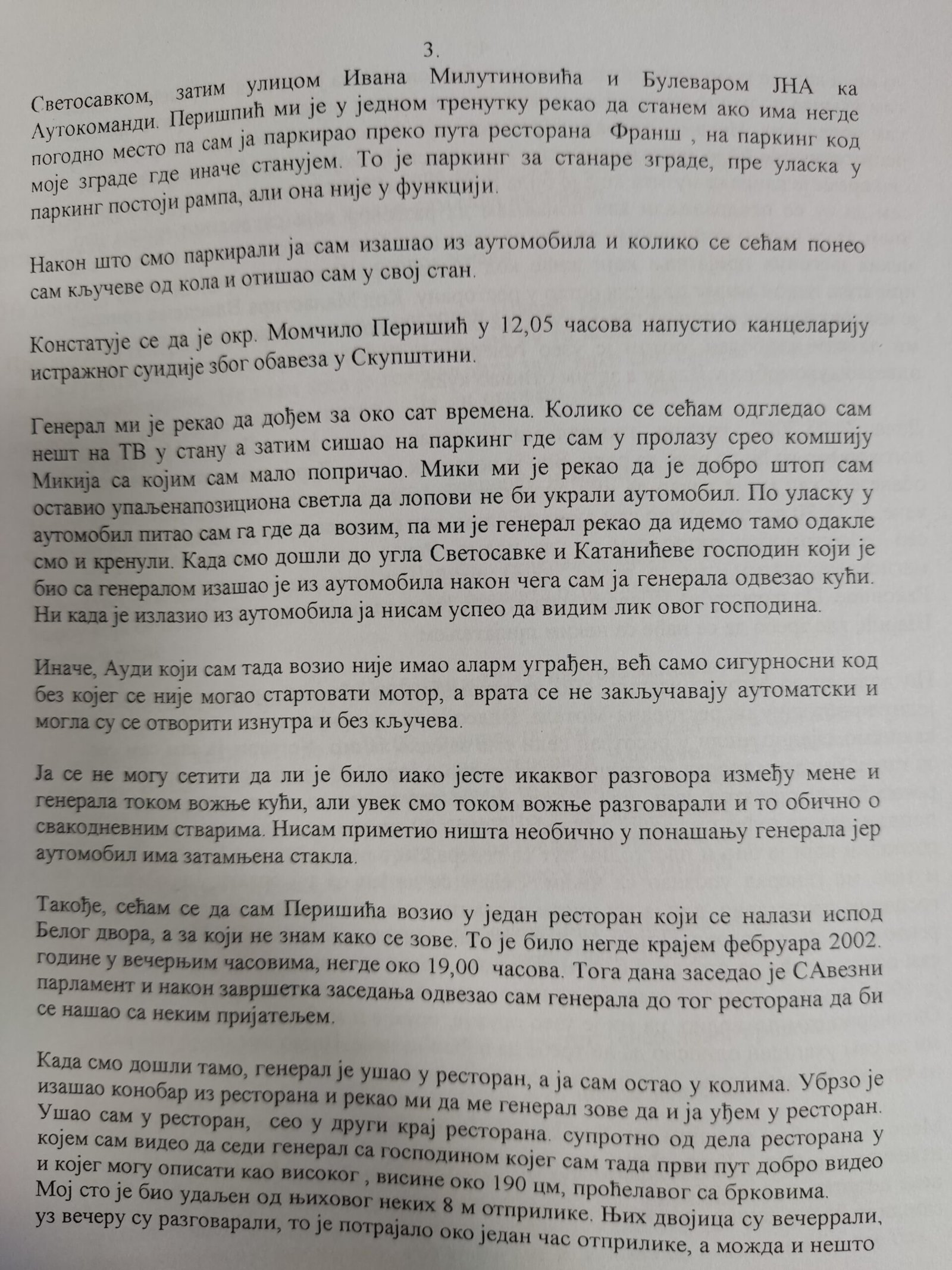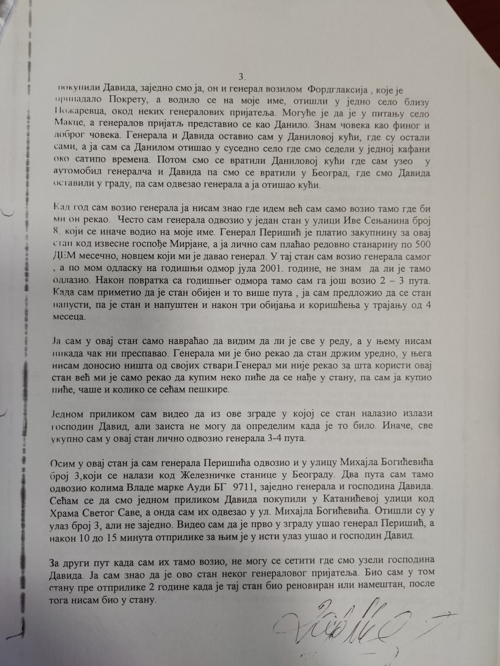 Izjava Zorana Đurića koji tvrdi što i ostali učesnici uviđaja iz motela „Šarić“, da je on vozio „maricu“ i da nije ulazio u restoran, te da nije učestvovao u pretresu osumnjičenih i fotografisanju oduzetih predmeta. Do detalja opisao ko je doneo i kad falsifikovanu potvrdu koju je Džon Nejbor odbio da potpiše.