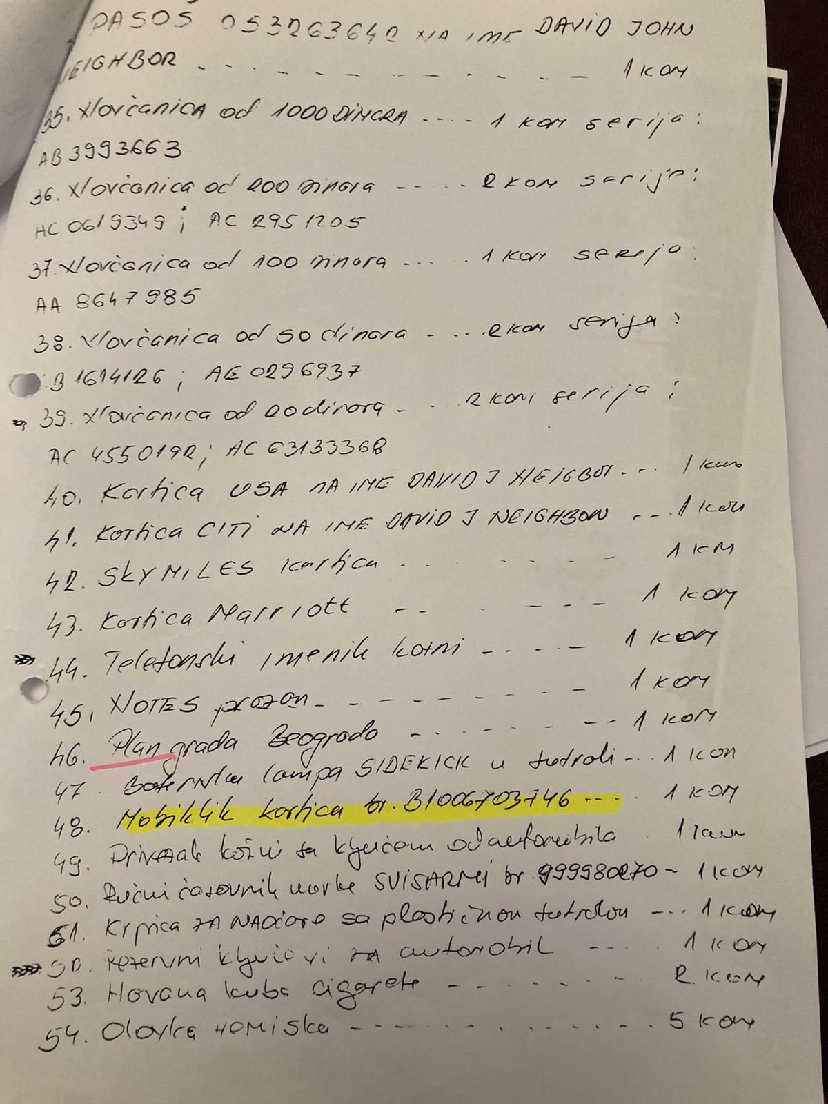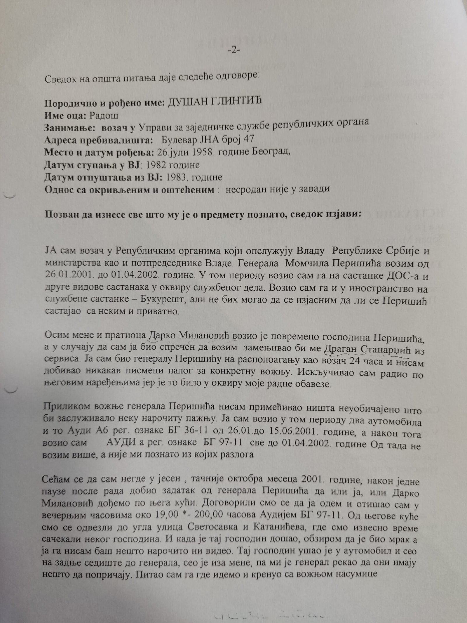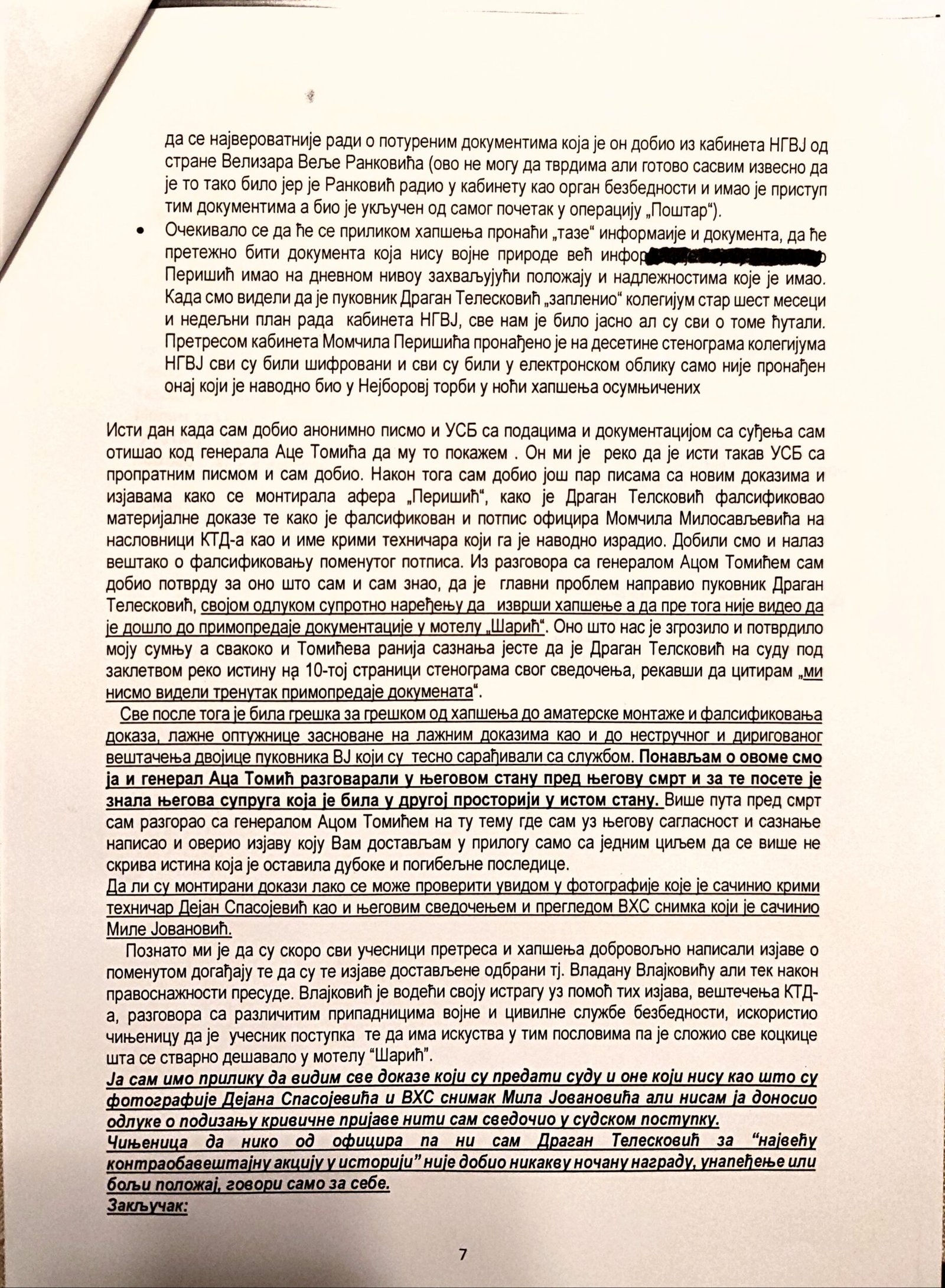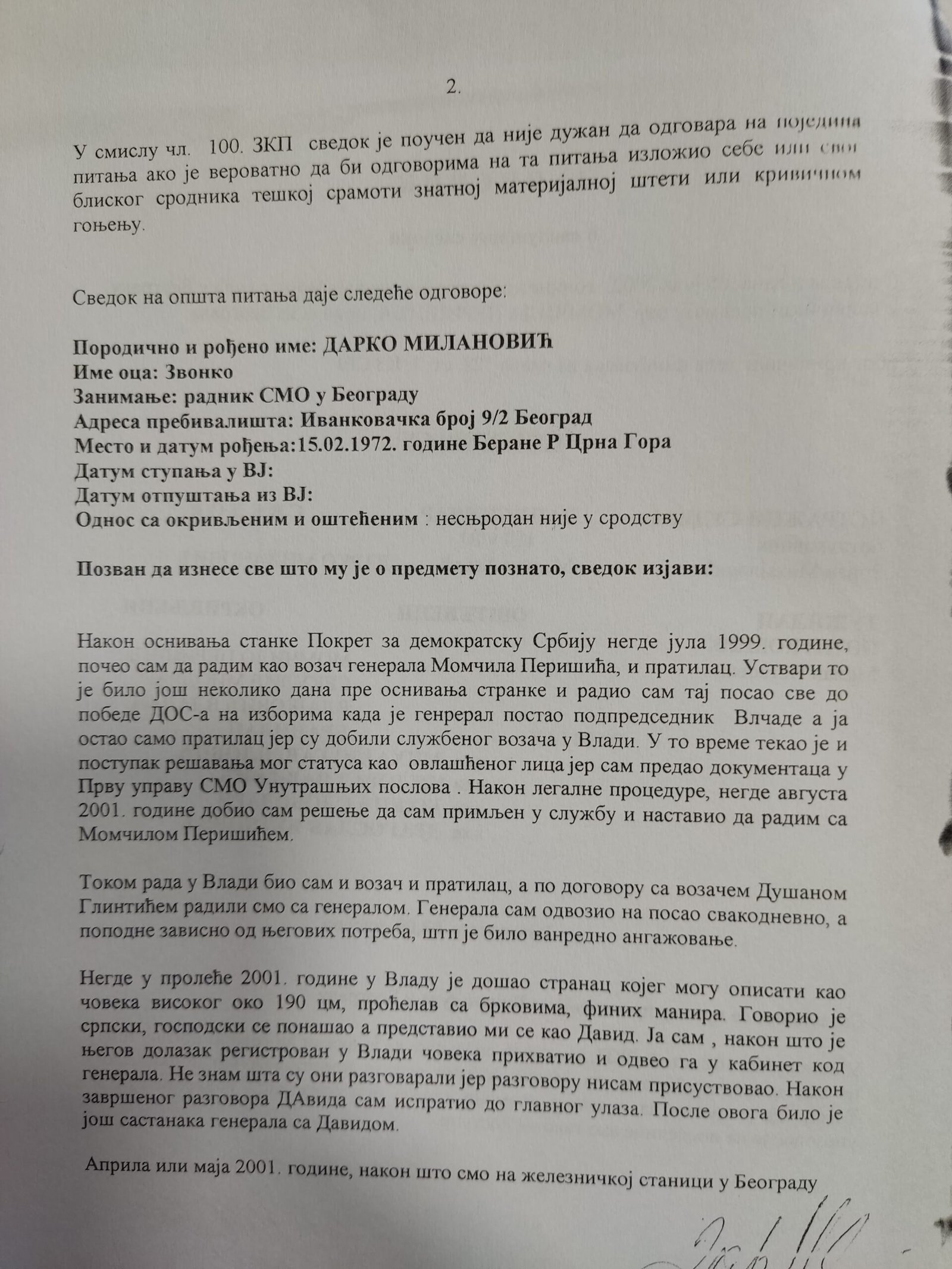 Izjava Zorana Đurića koji tvrdi što i ostali učesnici uviđaja iz motela „Šarić“, da je on vozio „maricu“ i da nije ulazio u restoran, te da nije učestvovao u pretresu osumnjičenih i fotografisanju oduzetih predmeta. Do detalja opisao ko je doneo i kad falsifikovanu potvrdu koju je Džon Nejbor odbio da potpiše.