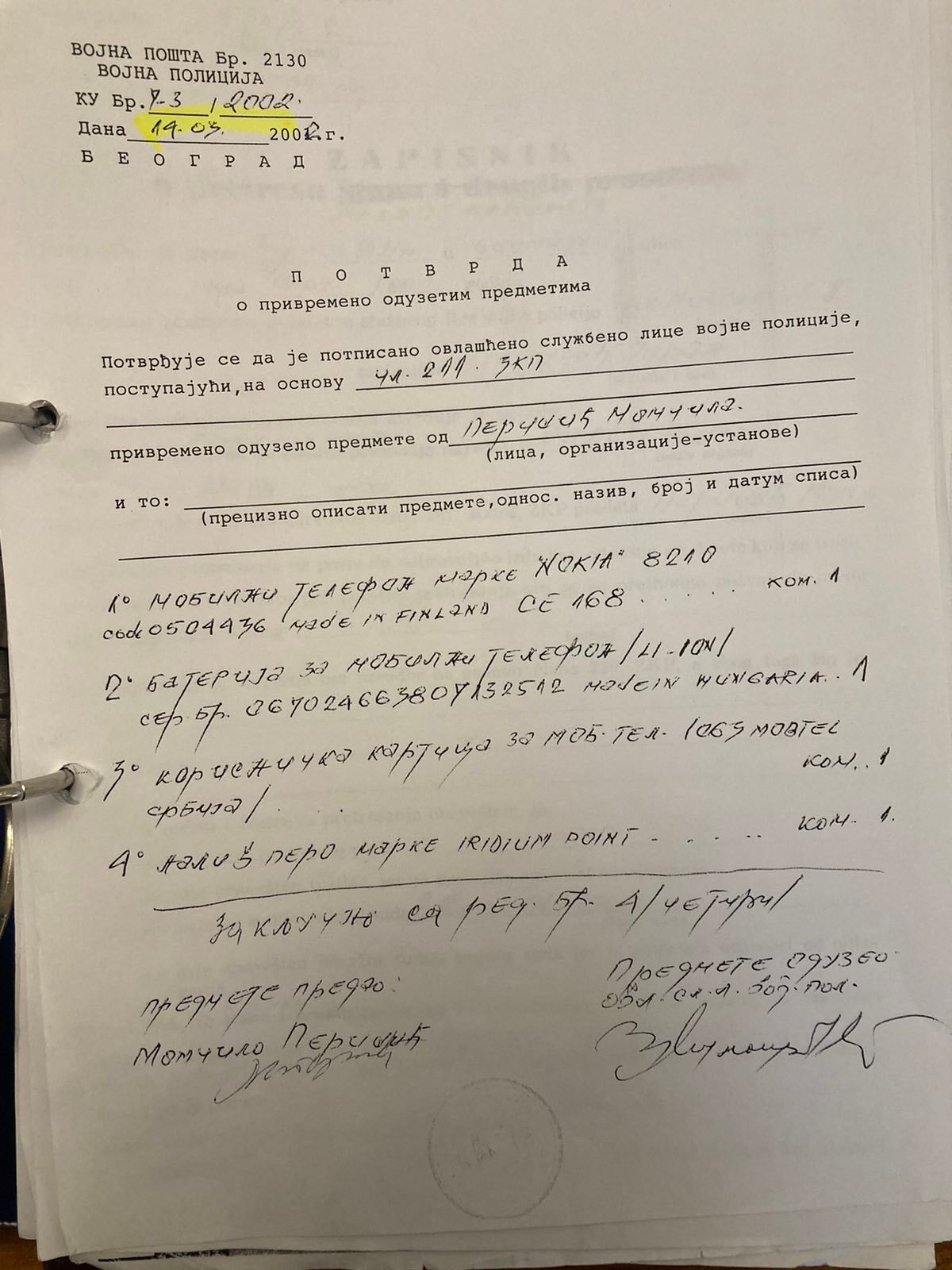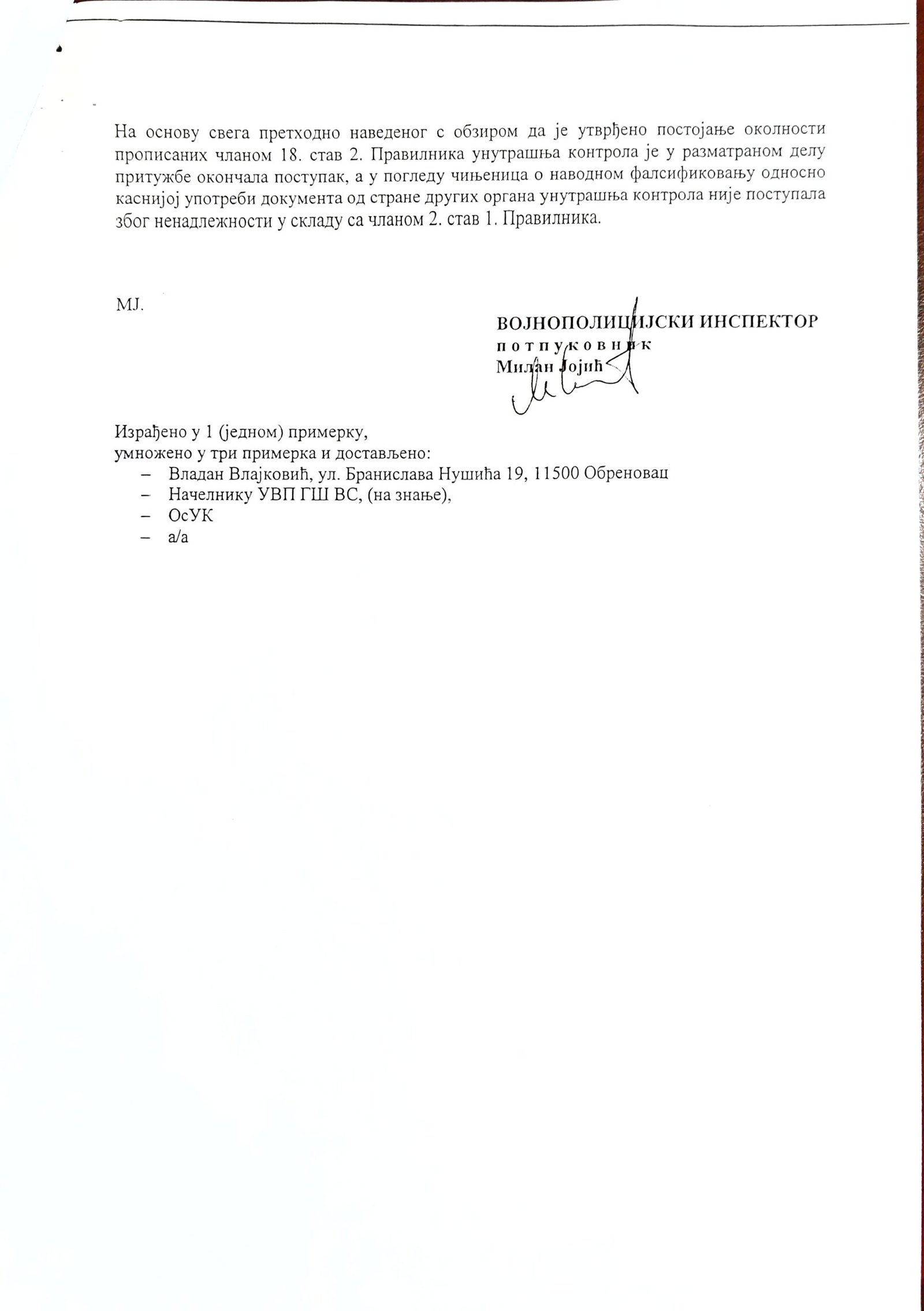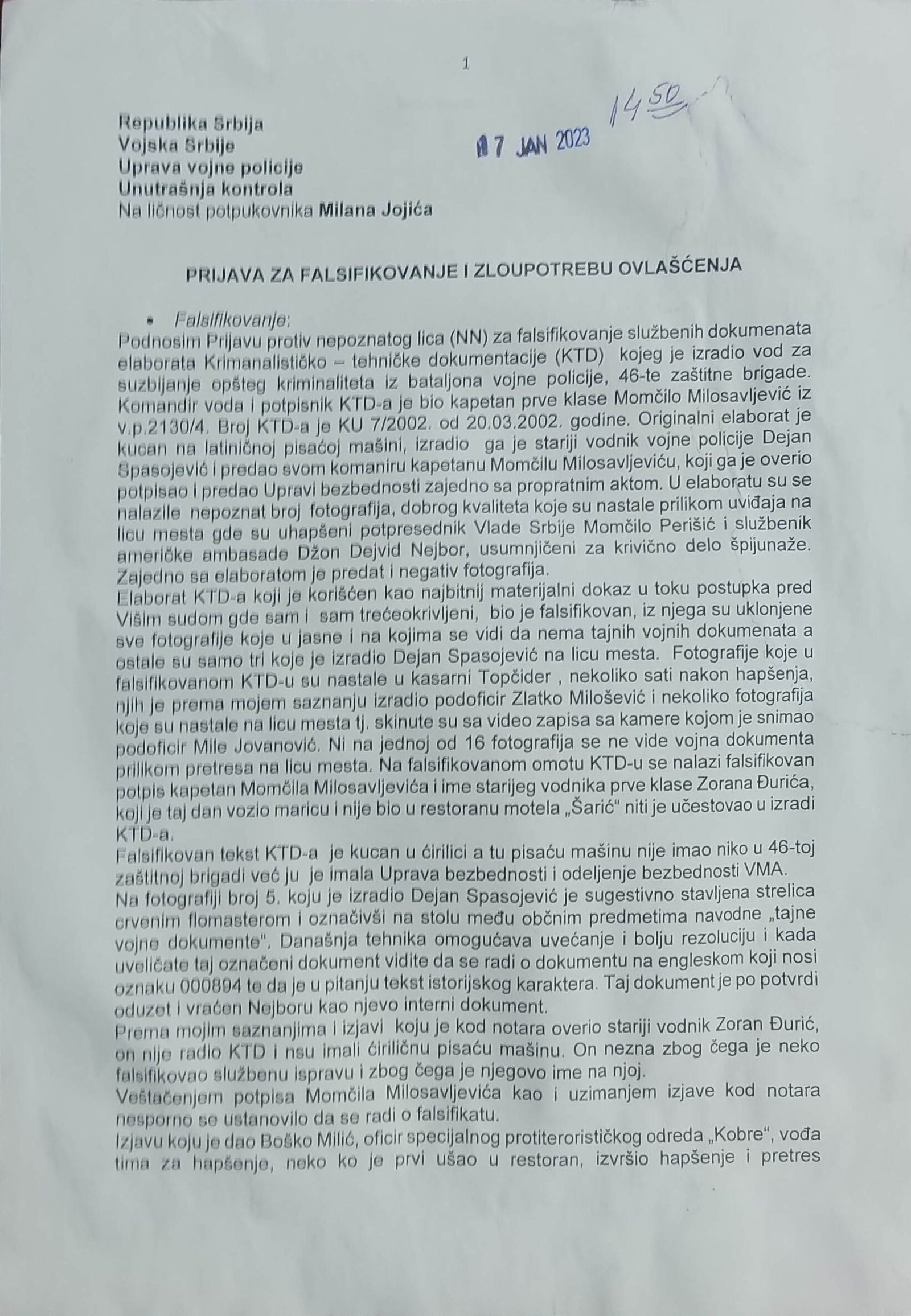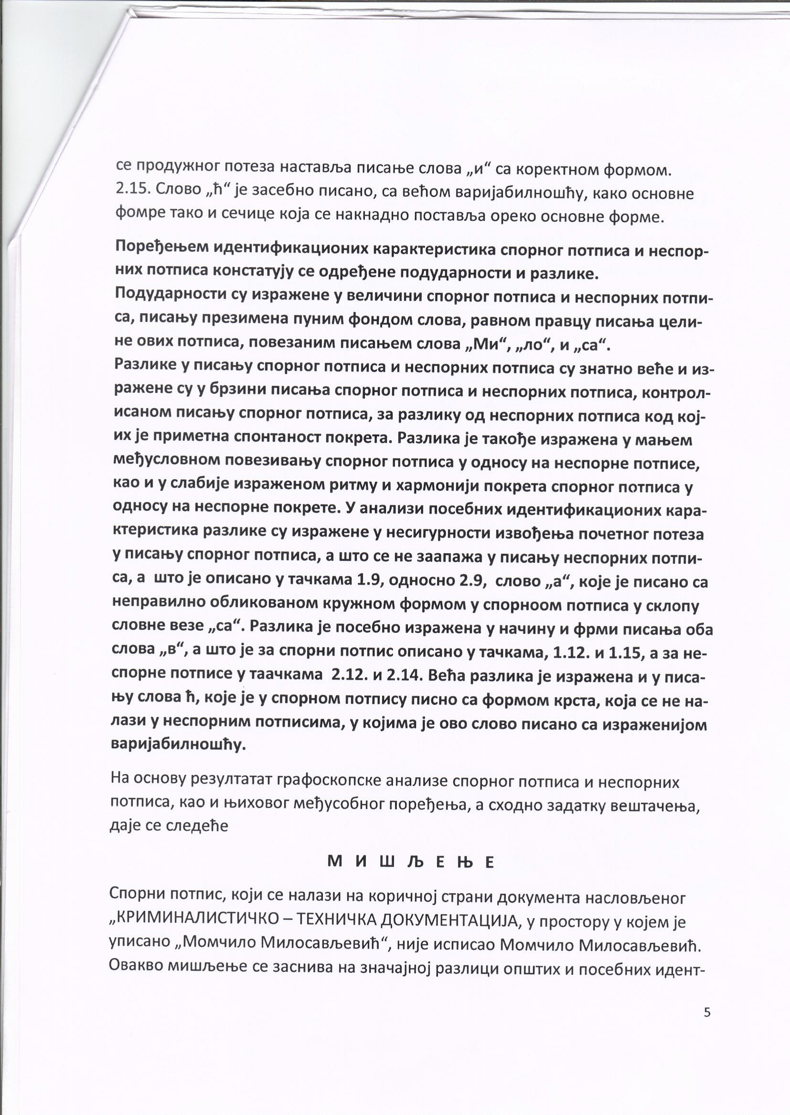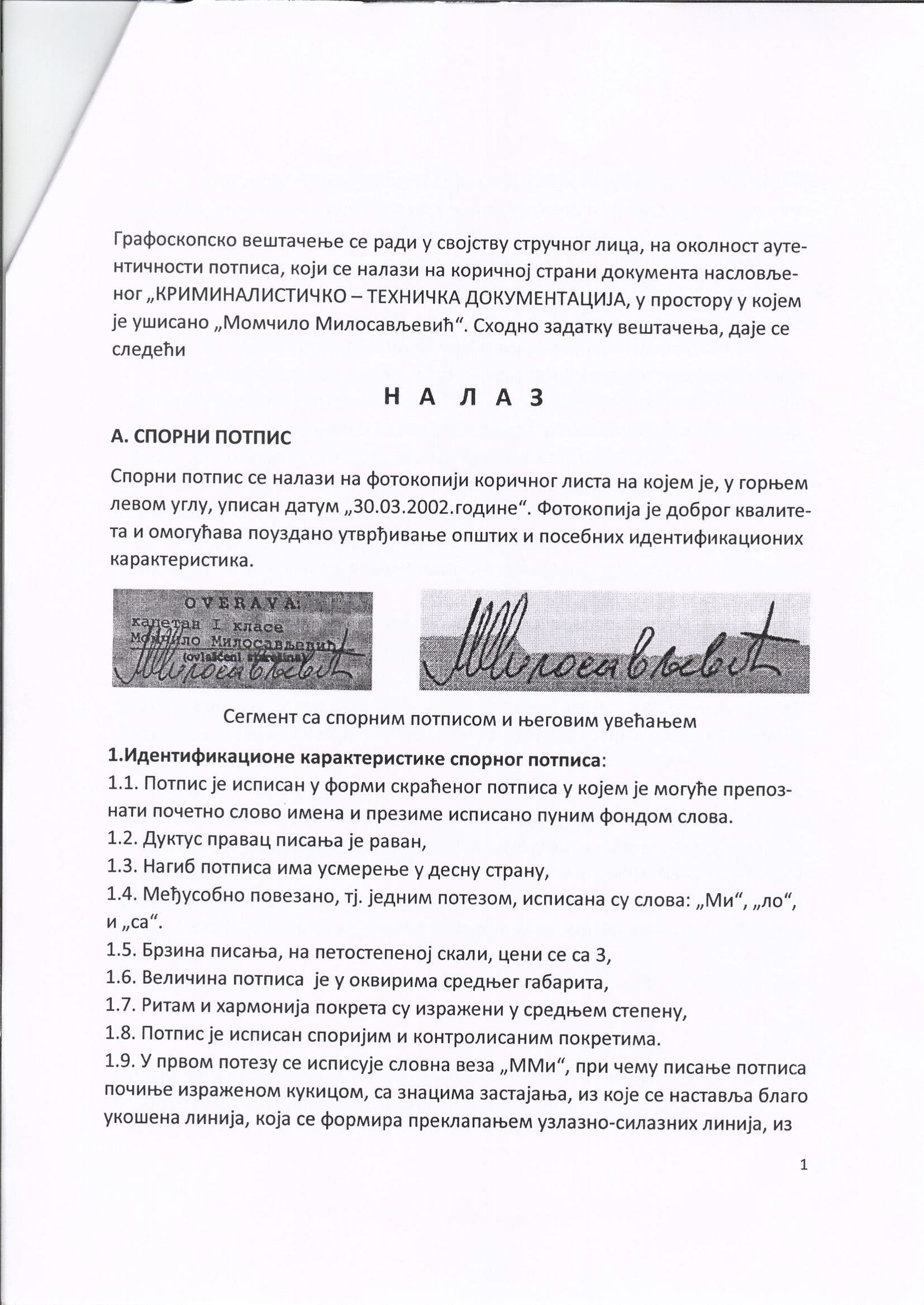 Veštačenje potpisa kapetana Momčila Milosavljevića na kriminalističko-tehničkom dokumentu