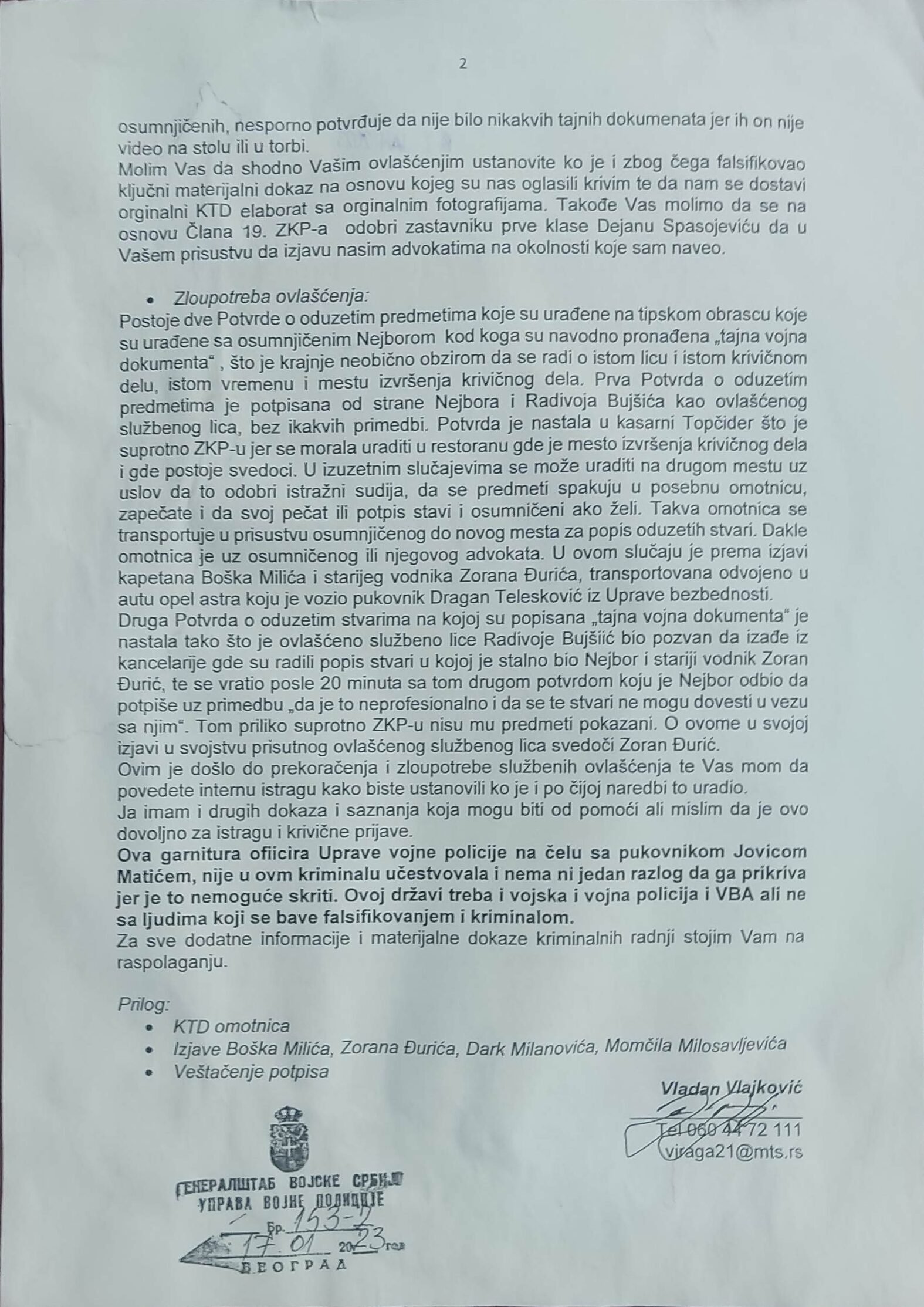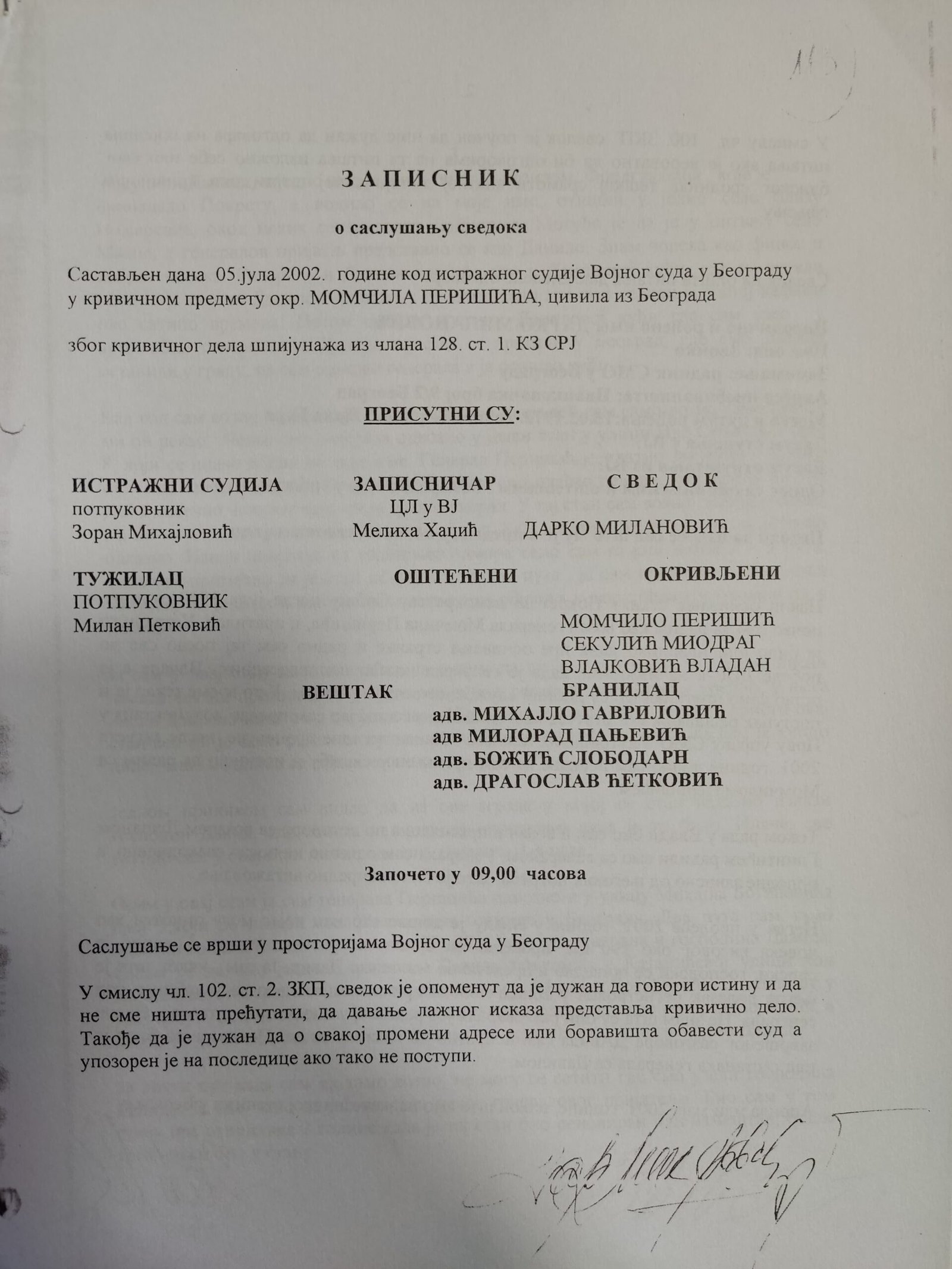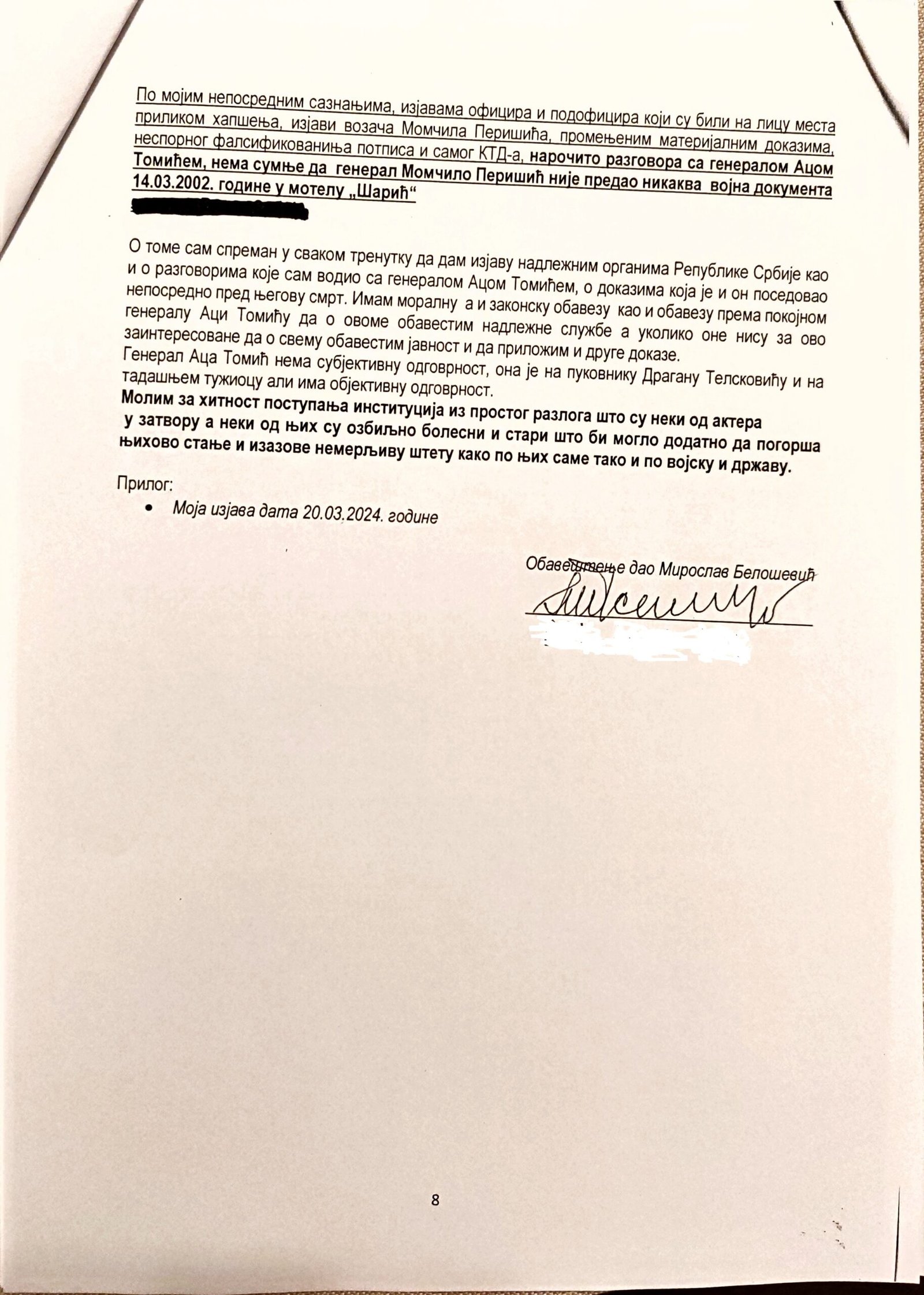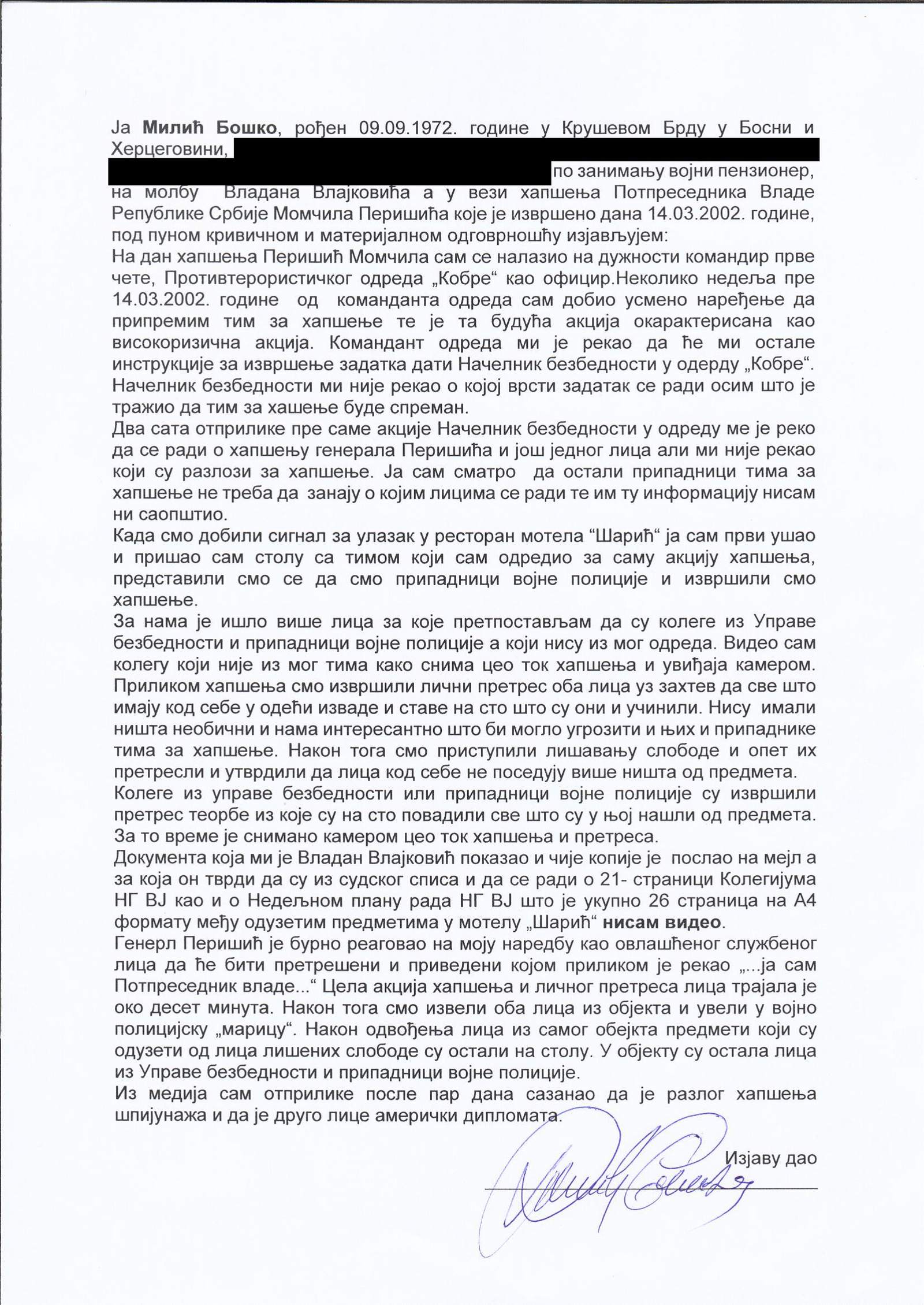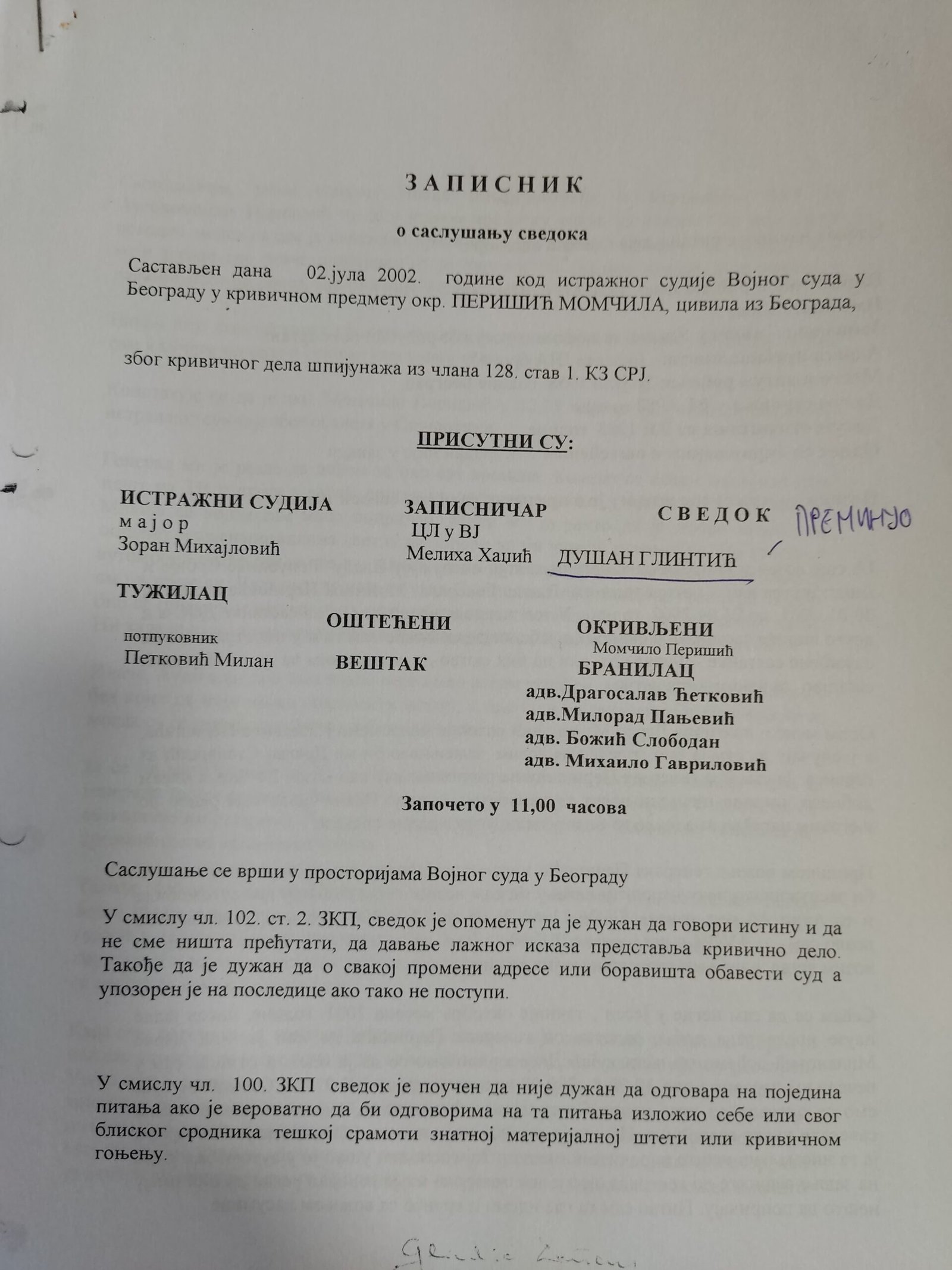 Veštačenje potpisa kapetana Momčila Milosavljevića na kriminalističko-tehničkom dokumentu