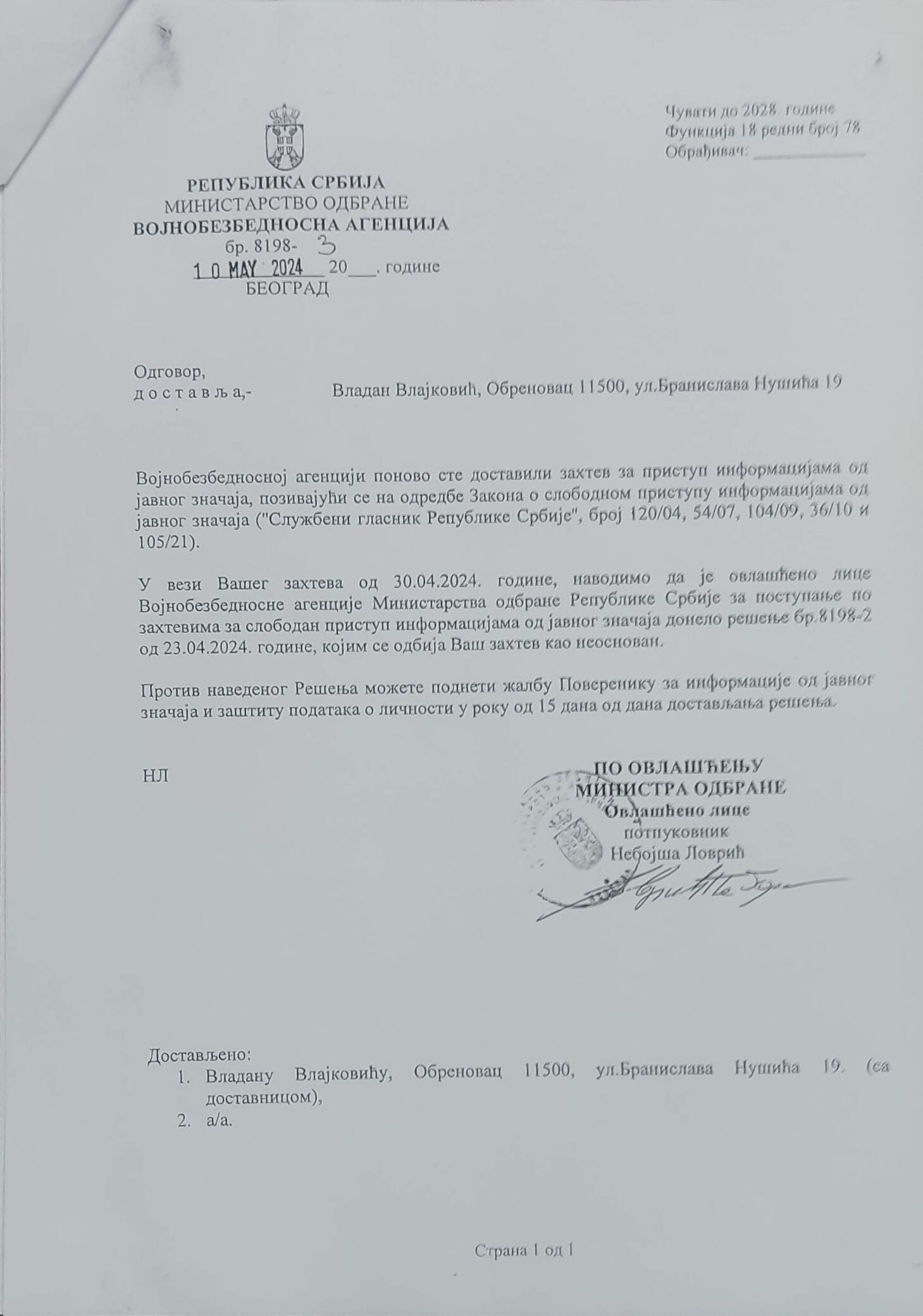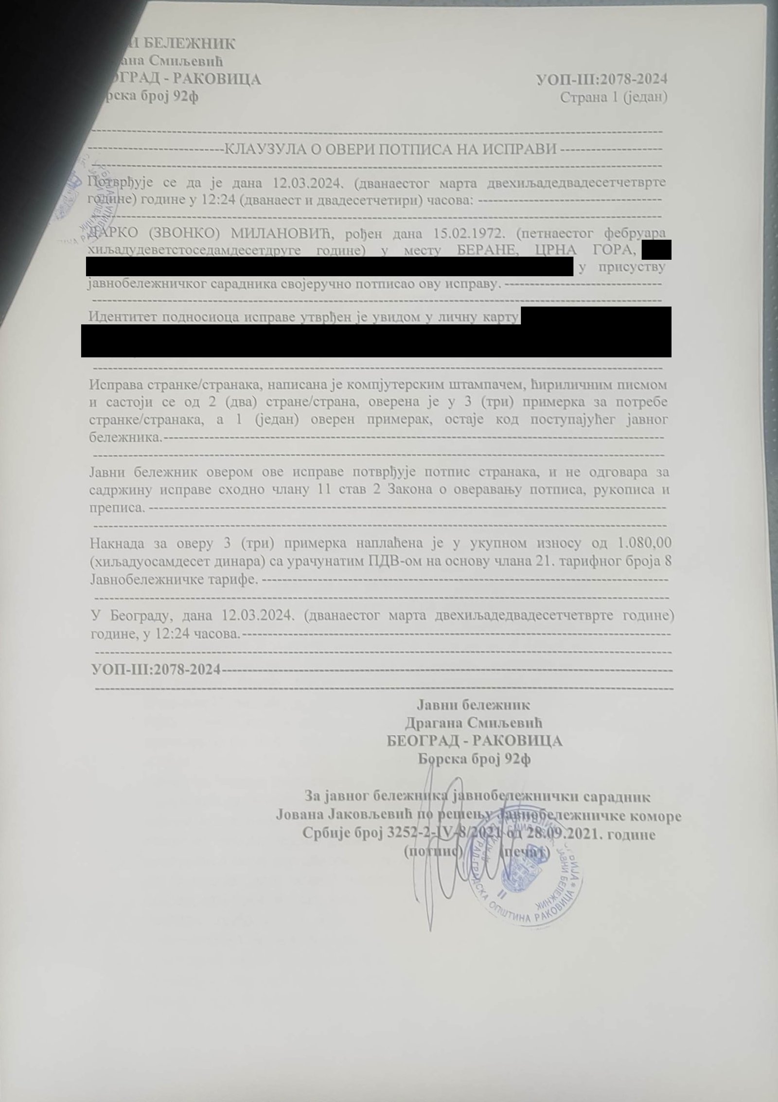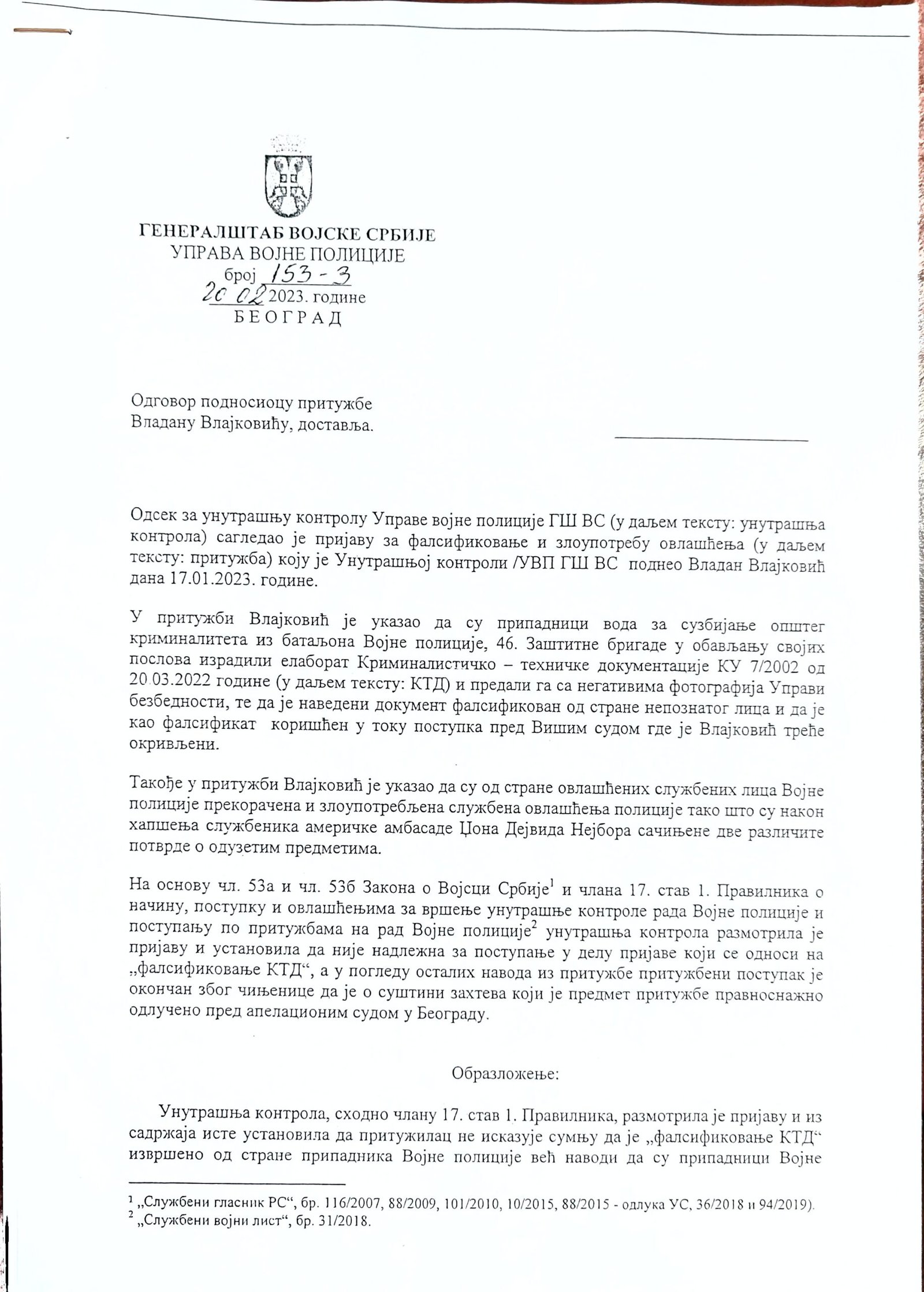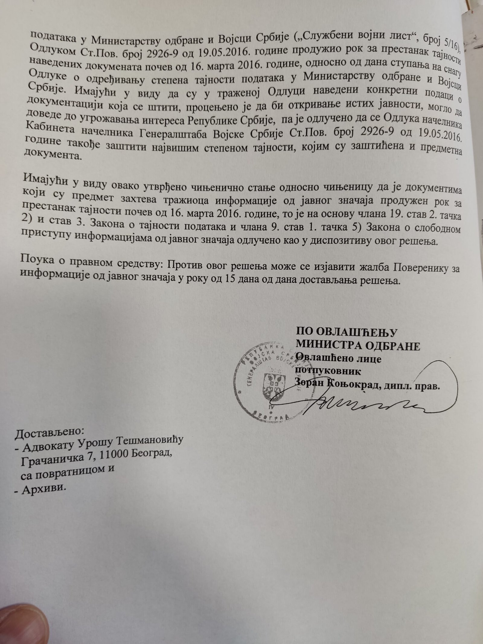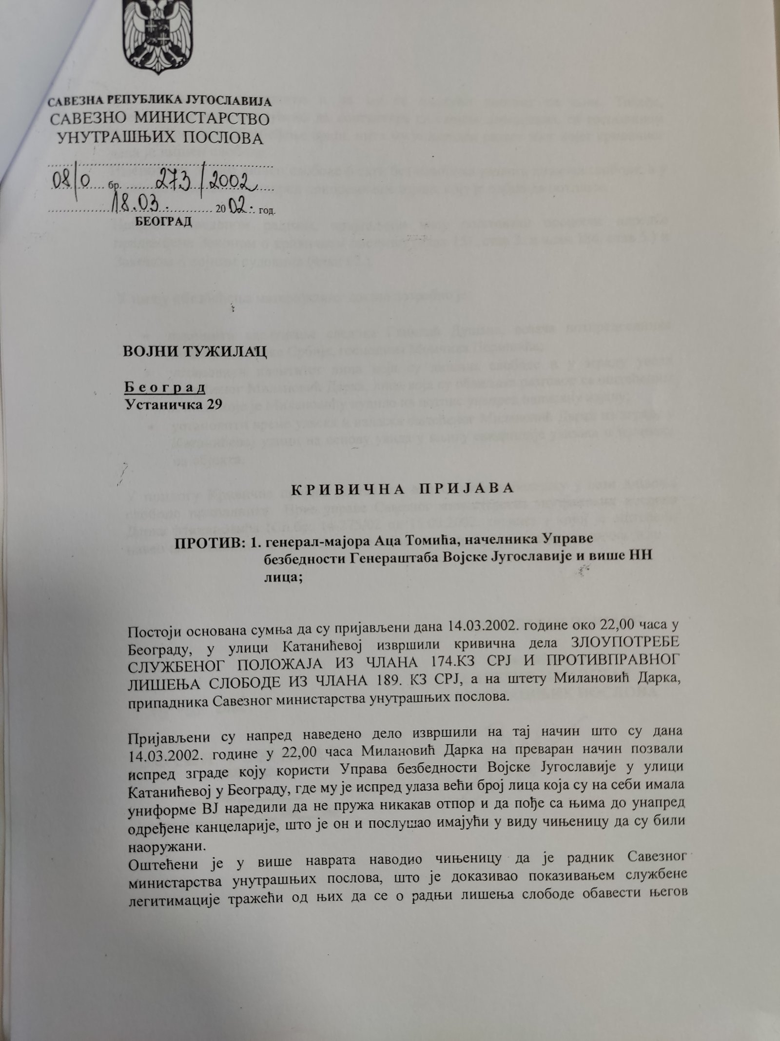 Veštačenje potpisa kapetana Momčila Milosavljevića na kriminalističko-tehničkom dokumentu